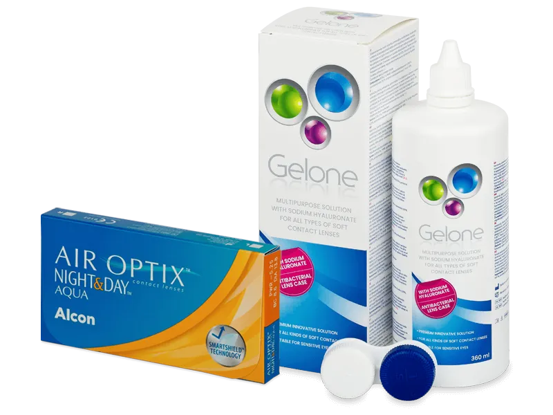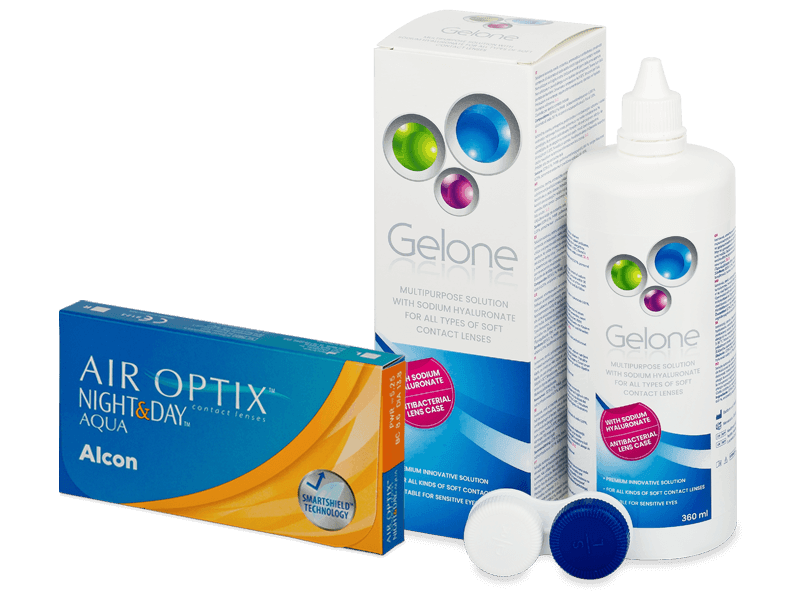 v balení s čisticím roztokem Gelone 360ml Air Optix Night and Day Aqua jsou kontaktní čočky s měsíční plánovanou výměnou. Air Optix Night and Day Aqua jsou výrobcem - společností Alcon - doporučeny kromě denního nošení (nasazení ráno, vyjmutí večer) i k takzvanému nošení kontinuálnímu. Během 30 dnů a 29 nocí není potřeba pár kontaktních čoček z oka vyjmout vůbec, ani na spaní.V příbalovém letáku však stojí, že kontinuální nošení musí být prokonzultováno s očním specialistou, který jej má nositeli schválit. Ne pro každého je tato forma užívání čoček vhodná. Nutno taktéž podotknout, že se názory na nepřetržitý způsob nošení kontaktních čoček i mezi odborníky velmi liší. Řada z nich jej nedoporučuje vůbec, někteří doporučují vyjímání např. maximálně po 5ti dnech a tak podobně.